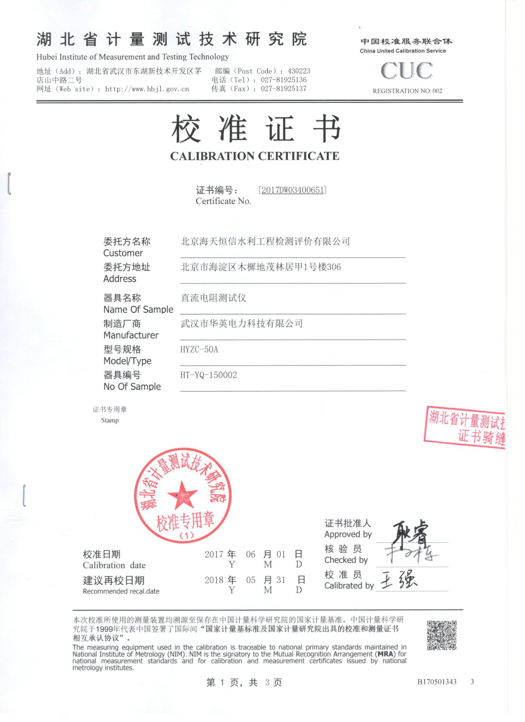 Calibration certificate of Winding Resistance Tester HYZC-50A issued by Hubei Institute of Measurement and Testing Technology